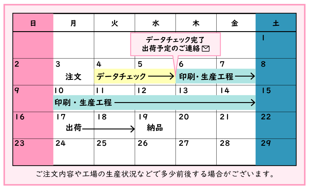 ※②のデータチェックで不備が見つかった場合は、再入稿が必要となりスケジュールが変わりますのでご希望納品日がある場合はご注意ください。