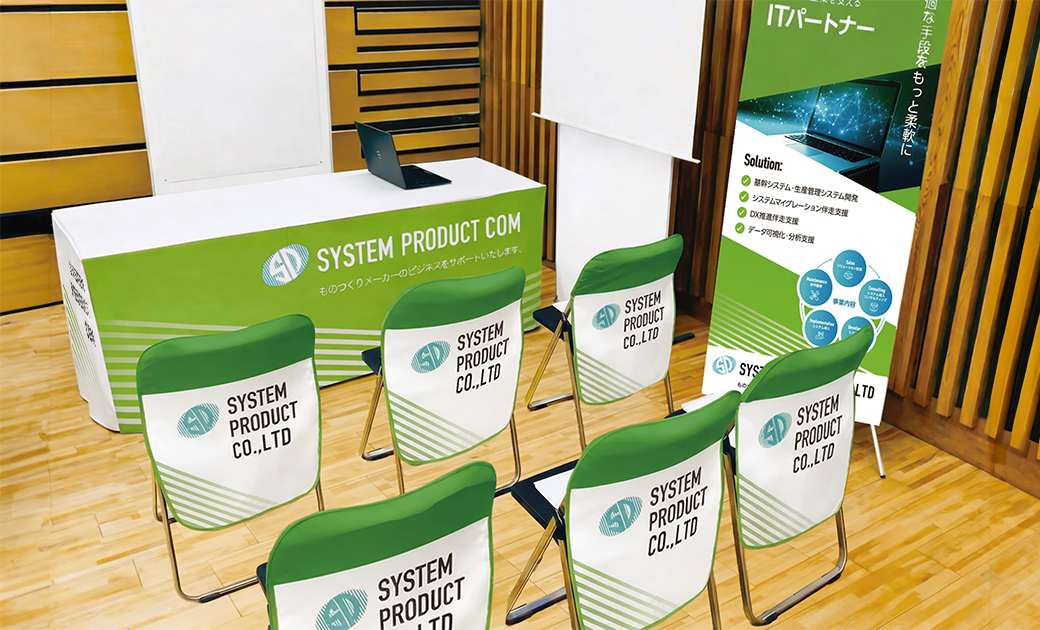 ブース入口へインパクトを持たすロールアップバナーを、また汎用性のあるアイテムとしてイスカバーをご提案。
